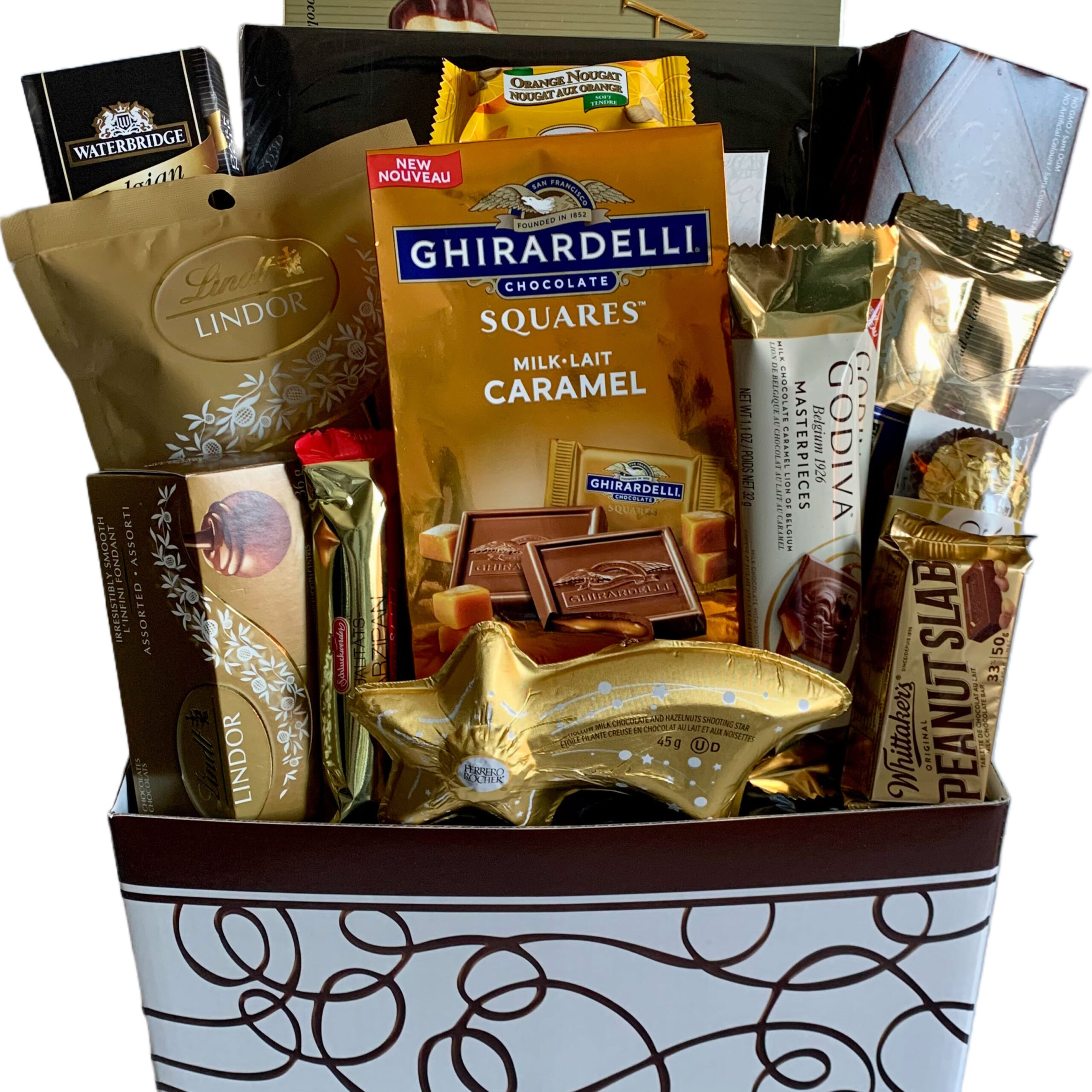 Wonderfully decadent, this chocolate gift box assortment will surely please the average chocolate lover. Lindt Chocolate Assortment, Belgian Chocolate Biscuits, Dark Chocolate Sticks, Godiva Chocolate Bars, Ghirardelli Chocolate Caramel Squares, Whittaker’s Peanut Slab, Ferrero Rocher Chocolate Star, Milk Chocolate Biscuits, Boxed Chocolate assortment.