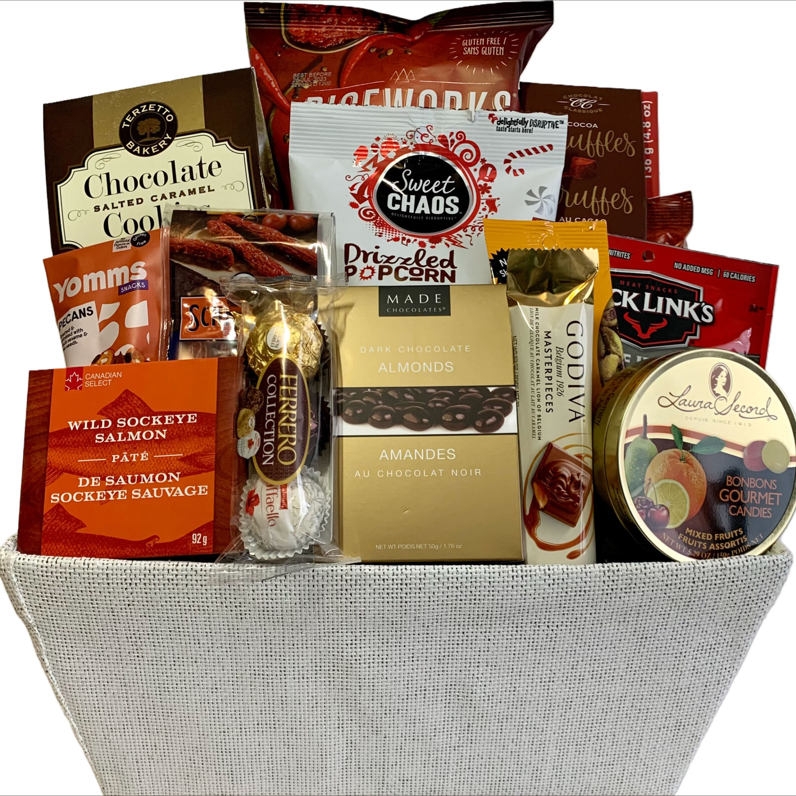 West Coast wild Salmon Pate, Salted Caramel Cookies, Sweet Chilly Rice Chips, Nutty Chia Pecans, Belgian Chocolate Covered Seashells, Honey Roasted Pistachios, Peppered Beef Jerky, Hot Buffalo Wings Pretzel Pieces, Godiva Caramel Chocolate Bar, Peanut Butter Clusters, Shortbread, Chocolate Covered Almonds, Belgian Milk Chocolate Cookies, French Truffles, Pepperoni Sticks, Fruit Mix Hard Candies. Butter Shortbread, Chocolate Drizzled Peppermint Crunch Popcorn.