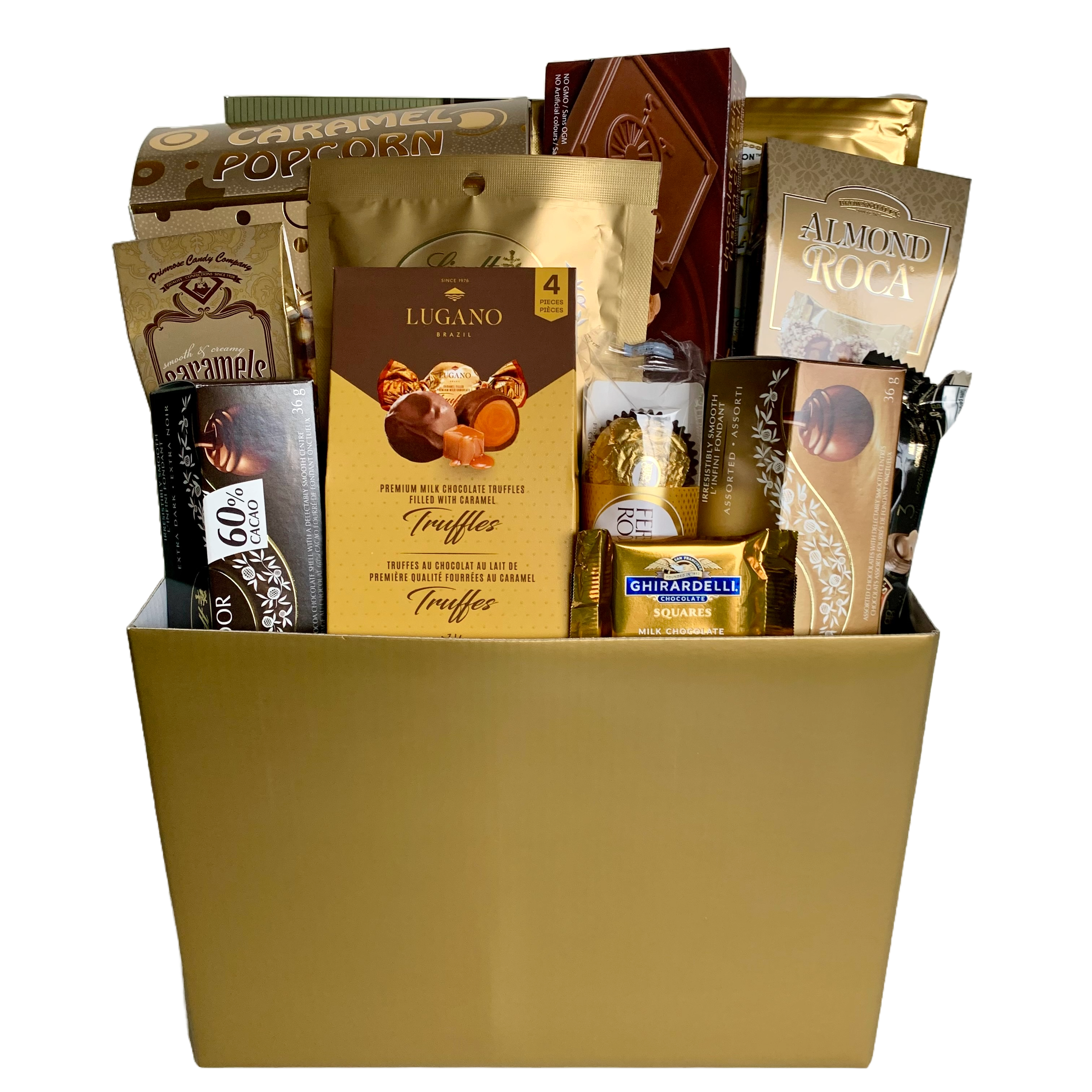 Caramel Popcorn, Belgian Chocolate Covered Cookies, Almond Roca Candies, Caramel Candies, Caramel Truffles, Hazelnut-filled Truffles, Bailey’s Irish Cream Candies, Almond Nougat, Dark Chocolate Lindt Truffles, Assorted Lindt Truffles, Ghirardelli Caramel Square.
